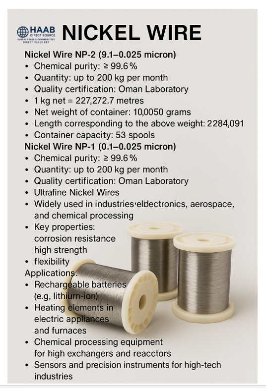 We supply ultrafine high-purity nickel wire designed for advanced industrial and high-tech applications. All products are laboratory-certified in Oman to guarantee quality and consistency.